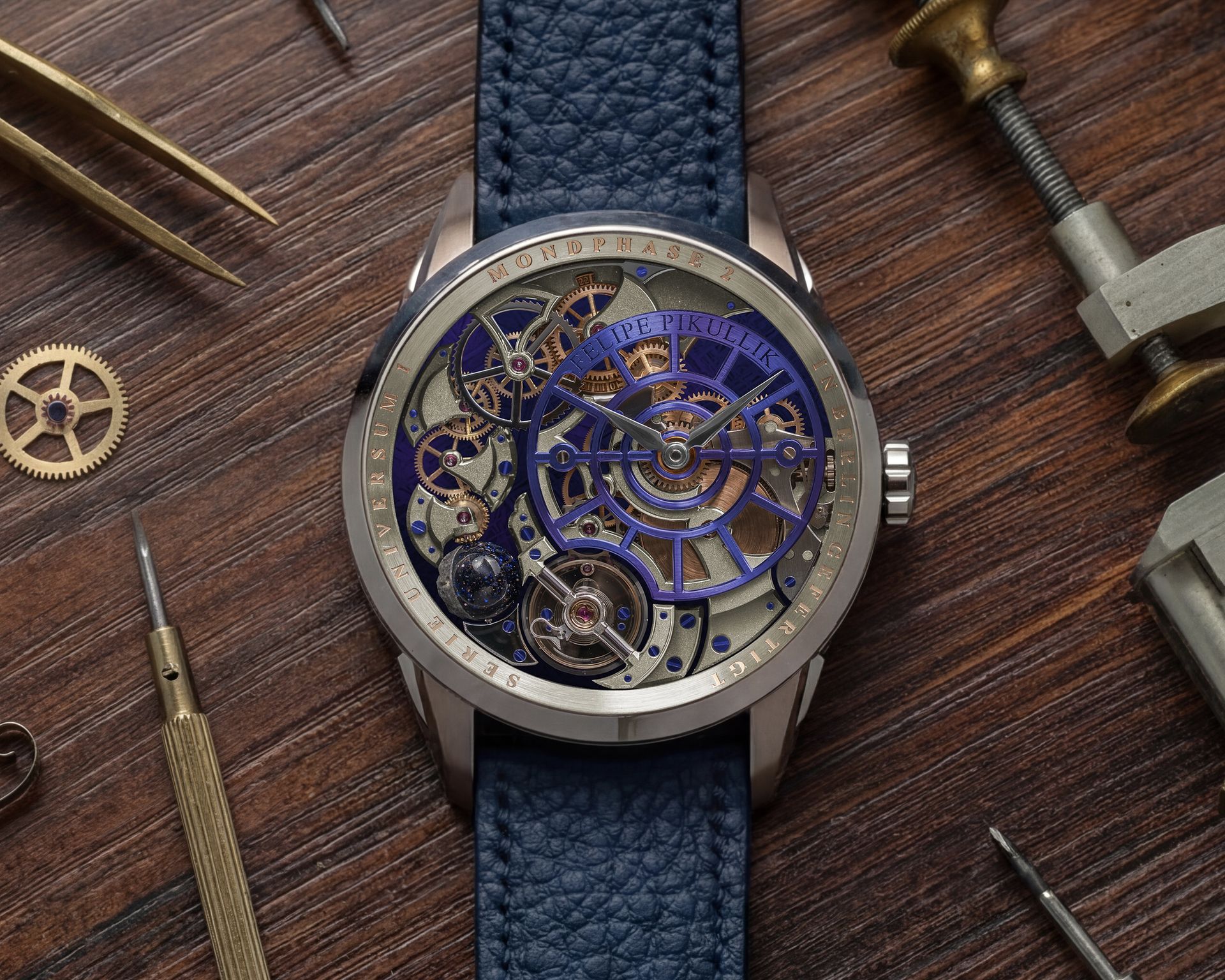The bridges are crafted from German silver, chosen for its soft, natural tone. In contrast, the dial elements and meteorite base are heat treated to achieve deep blue and violet hues. These colors are not applied, but created through temperature, allowing the tones to shift subtly between blue and purple depending on the light.