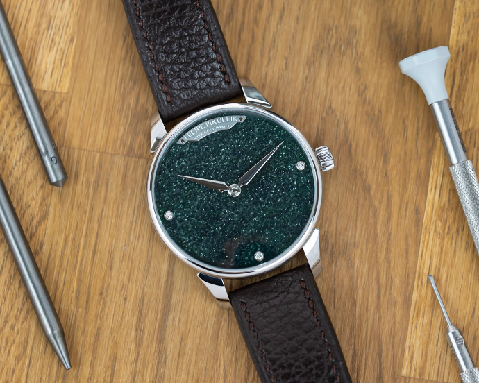 The dial is crafted from aventurine glass, available in green or deep blue, each capturing a different atmosphere of the night sky.